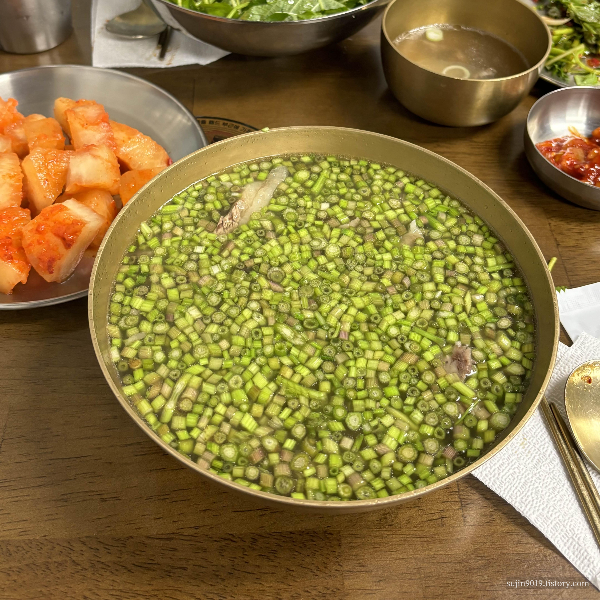 기본 반찬으로는 직접 담근 석박지와 오징어젓갈, 미나리무침이 제공됩니다. 오징어젓갈은 적당히 짭조름하니 맛있었습니다. 석박지는 먹음직스러워 보였지만 너무 물러서 식감이 아쉬웠습니다.
