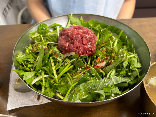 야채 양은 넉넉하고 양념이 자극적이지 않아 좋았어요. 아쉬운 점이 하나 있다면, 개인적으로 육회가 조금 더 넉넉하게 있었다면 좋았을 것 같습니다.